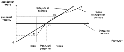На схеме в дополнение к пороговому и нормативному значению результата (реализации или прибыли) откладывается точка Х2 реальных заработных плат в фирме на настоящий момент (для наглядности показаны окладная и процентная система). Переход к новой системе стимулирования значительно облегчается, если точки Х1 и Х3 соединить не лучом, а кривой, включающей точку Х2. В этом случае при неизменном результате сотрудники получают прежнее вознаграждение, а не пониженное, и при достижении нормы выходят на среднерыночный уровень зарплат.