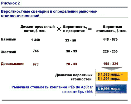 h3>Оценка стоимости (пример)Мы применили свой метод в 1998 г. для оценки "снаружи внутрь" стоимости бразильской розничной продовольственной сети Pao de Acucar. Прогнозы составлялись с помощью трех макроэкономических сценариев, опубликованных инвестиционным банком Merrill Lynch (рис. 1).