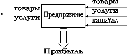 Система (предприятие) производит некий продукт (товары, услуги) и потребляет для производства некоторые продукты (товары, услуги и капитал); результатом работы системы является прибыль; управляющие связи системы осуществляет менеджмент.