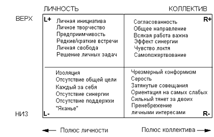 Джонсон разработал метод управления полярностью, что дало способ постоянно работать со всей картиной в сложных ситуациях, таких как преобразования (Johnson, 1992). На Рис. показана полярность в поведении личности и команды.