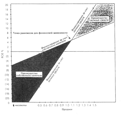 - Линия заемных средств имеет более крутой подъем, чем линия собственного капитала. Это показывает, что при увеличении объемов продаж ROE (прибыль на собственной капитал) повышается гораздо быстрее при зависимой структуре капитала.