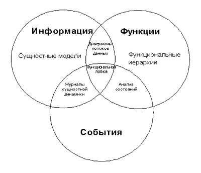 | В этом разделе описывается та часть подхода Р. Баркера к проектированию информационных систем, которая соответствует методикам моделирования бизнеса. Подход носит название "CASE*Method". Внедрение информационной системы всегда приводит к реорганизации бизнеса. В значительной степени предмет деятельности остается без изменений, в то время, как меняются способы и участники этой деятельности. Модели, используемые для определения потребностей бизнеса, должны позволять делать обоснованные изменения в организационной структуре. Эти модели должны как можно меньше зависеть от известных информационных технологий. Система должна быть открыта в сторону введения новых процедур, например, производства, продаж, управления или учета. Требования должны моделироваться и определяться настолько общим способом, насколько это возможно; функциональные потребности должны определять что делается, а не как или кем. Структура данных должна быть рассчитана на изменения в организационной структуре и на текущие и ожидаемые исключения и ограничения. Приведенная на Рис. 1 диаграмма иллюстрирует несколько главных технологий моделирования, а также места их пересечения. Каждая из этих моделей реального мира должна соответствовать контексту общего направления бизнеса, которое определяется его задачами, приоритетами и критическими для успеха факторами.