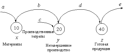 Обозначим также буквами x, y и z входящее сальдо на счетах 10 (материалы), 20 (незавершенное производство) и 40 (готовая продукция), а знаками x', y' и z' исходящее сальдо на этих счетах соотвественно. Очевидно, что тогда будет верна следующая система уравнений: