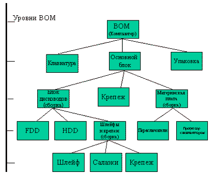 | Еще более серьезные проблемы стали возникать при усложнении производства и создании изделий, количество составных частей которых измеряется тысячами, при том что сборка осуществляется на нескольких сборочных конвейерах. Изделия, производимые в ходе таких процессов, стали представлять в виде древовидных конструкций, получивших общее название BOM - "bill of material" (в русском языке нет точного эквивалента, есть только более "узкие" аналоги, такие как "состав изделия", "рецептура", "сборочная спецификация").