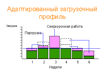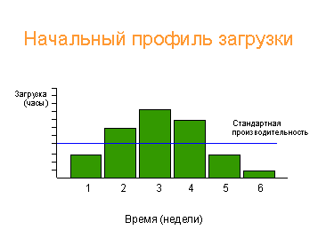 Если увеличить производительность доступными способами не удается, то, чтобы удовлетворить требованиям MRP, возможно, придется перепланировать MPS. В простейших бизнес-моделях систем MRP производительность рабочих центров обычно считается неограниченной и такие проблемы не возникают. Но так как реально ситуация иная, то современные MRP-системы предоставляют возможность производить планирование в условиях ограниченных ресурсов. Ниже приведен пример "адаптации" загрузочного профиля к реальным производственным мощностям.