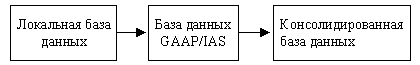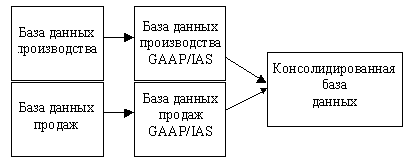 Под локальной базой данных понимается текущая база, в которой фиксируются все операции месяца. Как правило, это проводки, сделанные в Главной книге, проводки из Модуля Закупок, Модуля Продаж, Регистра Основных Средств, а также из Модуля Расчета Заработной Платы. Основная валюта локальной базы - локальная (для России - рубли), вторая валюта - как правило, доллары США (валюта, используемая при ведении управленческой отчетности). Используется локальный план счетов. База данных GAAP/IAS является отражением локальной базы данных в западном (корпоративном) плане счетов: каждая проводка локальной базы переносится в базу GAAP/IAS без консолидации, с сохранением своего описания, ссылок и источника. Правила соответствия корпоративного плана счетов локальному устанавливаются с помощью процедуры мэппинга (mapping). Основной валютой становятся доллары США, второй валютой - локальная валюта. Кроме базы данных GAAP/IAS, второй базой данных может быть любая другая корпоративная база. Консолидированная база данных - конечная для составления финансовой отчетности. В нее стекаются проводки из всех баз данных GAAP/IAS, каждая из которых отражает одну локальную базу. Например, для компаний, занимающихся и торговлей, и производством, будет характерна следующая структура: