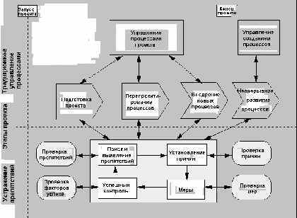 | Чтобы устранить очаги сопротивления, я создал ядро из начальников 24 отделов. Они стали частью стратегии, прониклись ей и передали свои взгляды подчиненным. Они преодолели противодействие, беседуя с людьми глазу на глаз. Впрочем, простого влияния коллег недостаточно, и приходилось проявлять бдительность, предвосхищать проблемы и тактично их решать. - Макс Штребель (Max Strebel), Президент Union Bank, Швейцария. Устранение препятствий (Barrier Management) - новая задача для руководителей в ходе реинжиниринга предприятий. Технические шаги дополняются мероприятиями по управлению переменами. Устранение препятствий решает сложные человеческие проблемы, связанные с реформами (см. Рис.). Рис. Взаимосвязь управления проектом по реинжинирингу и устранения препятствий