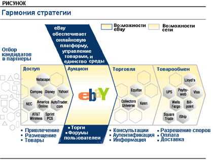 | Дирижеры сетей объективно оценивают себя и определяют направления деятельности, в которых им лучше всего удается завоевать лидерство на своем рынке. При этом им нередко приходится отказываться от других направлений, даже прибыльных или потенциально прибыльных. Затем дирижеры приступают к созданию платформы для взаимодействия участников сети. В этом качестве Cisco использует Cisco Connection Online - Интернет-канал для упорядочения и распространения информации, поступающей от клиентов и партнеров компании. Платформа компании eBay - программы проведения аукционов, созданные сообществом продавцов и покупателей. Фирма обеспечивает управление продуктами и сбытом в производственно-коммерческой цепочке, а ее партнеры (например Billpoint, iShip, Mail Boxes Etc., Tradenable и UPS), в зависимости от специализации, берут на себя получение платежей, рассылку и другие важные функции (Рис. 3).