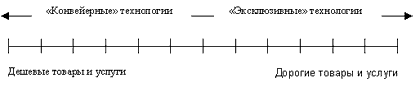 Если сектор наиболее дешевых товаров и услуг на рынке обозначить одной крайней точкой отрезка, а наиболее дорогих другой, то полученная шкала отразит динамику изменения технологий, используемых в каждой области (Сх. 8).