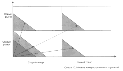 Если взять предприятие за начало координат, по одной оси расположить рынки (от максимально близкого и известного до нового, неисследованного), а по другой продукцию (распределенную по тому же принципу), то получим аналоговую интерпретацию известной матрицы Анзоффа, удобную для практических решений (Сх. 10).