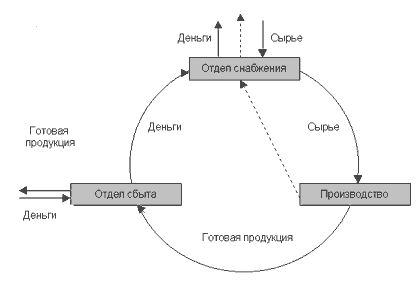Пунктирными линиями показаны бартерные поставки предприятием готовой продукции в обмен на сырье. Поступление и выплата денег отражаются на счетах фирмы и являются объективными цифрами. Стоимость сырья, частично получаемого по бартеру, а также готовой продукции до ее реализации, «виртуальна». Другими словами, может, например, считаться, что сырье поступает в производство с 10-процентной надбавкой в цене (рентабельность отдела снабжения), при обработке прибавляются себестоимость процесса и рентабельность производства, сбыт зарабатывает на разнице между входной условной ценой и рыночной. Собственные нормативные величины предприятия позволяют учесть все движение активов в любой момент времени, даже если цикл занимает полгода. В этой ситуации особое значение приобретают приоритеты высшего руководства. Вопрос о том, прибыльно или убыточно подразделение, участвующее в цепочке, де-юре определяется качеством и мотивами отнесения затрат и промежуточных наценок на счет конкретного звена. При производственной ориентации фирмы сбыт и снабжение считаются неэффективными придатками основной структуры, едва способными окупить собственное существование. Например, на производство относится 30% рентабельности, а снабжение и сбыт пытаются «выжать» с рынка по 5%. При сбытовой ориентации производство может работать едва ли не «в убыток» («за что им вообще деньги платить, неизвестно»), а сбыт приносит предприятию 30% валовой прибыли. |